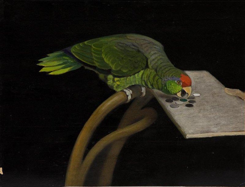 На картоне горизонтального формата на чёрном фоне изображен сидящий на спинке венского стула попугай амазон краснолобый боком, головой вправо. Перед птицей с зелёным оперением и красными перьями на голове изображена серая дощечка с кружками белого, светло-серого и тёмно-серого цветов и кружком зелёного цвета. Попугай вытянул голову, открыл желтый клюв и готовится взять зелёный кружок. Справа виден палец испытателя, держащего дощечку.