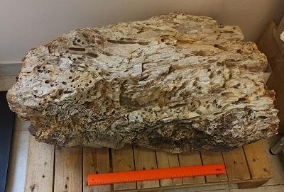 Фрагмент ствола древнего растения. Ископаемая окремнённая древесина с ходами "корабельных червей". Древесина замещена халцедоном кремового цвета. Возможно сохранение клеток! Ходы "корабельных червей" представляют собой беспорядочно ориентированные каналы толщиной до 2 см, инкрустированные молочно-серым опалом."