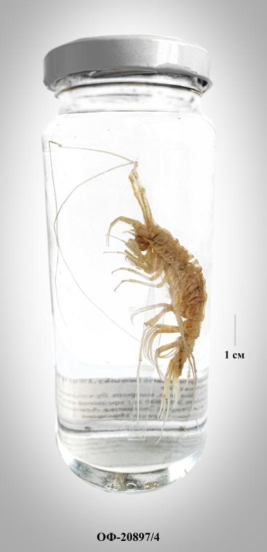 Влажный препарат ОФ-20896/4: Байкальский Бокоплав, или Амфипода, - Garjajewia sarsi Sowinsky, 1915. 1 ad - с непигментированными («норма») глазами; пол не определён. Банка 03/13-228. Научно-коллекционный карцинологический препарат. Пол: не определен. Возраст: ad