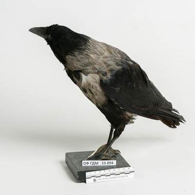 Чучело. Сeрая ворона. Corvus cornix L.,1758. Классификация: Хордовые Chordata, Позвоночные Vertebrata, Птицы Aves, Воробьинообразные Passeriformes, Врановые Corvidae, Сeрая ворона Corvus cornix L.,1758