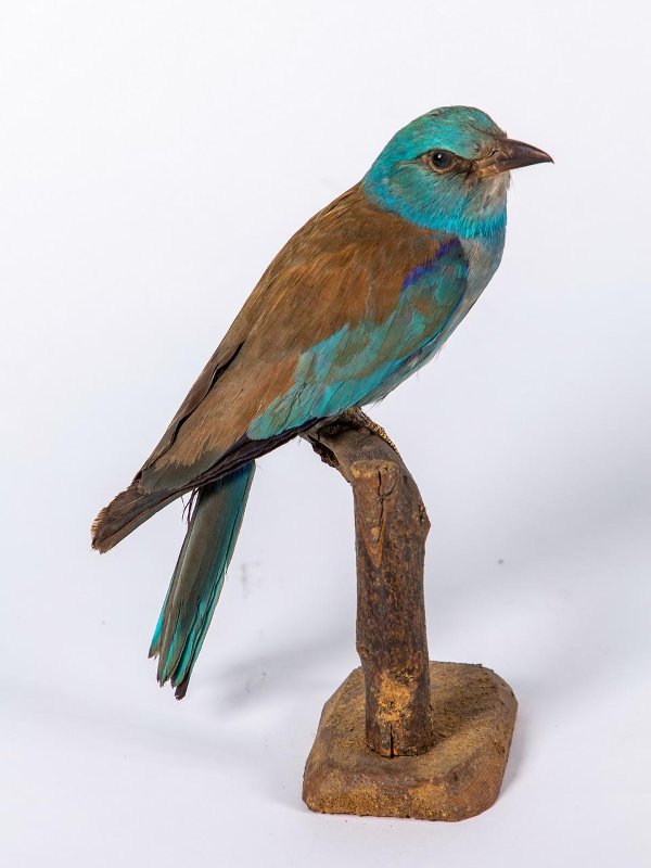 Чучело. Сизоворонка. Coracias garrulus L.,1758. Классификация: Хордовые Chordata, Позвоночные Vertebrata, Птицы Aves, Ракшеобразные Coraciiformes, Сизоворонковые Coraciidae, Обыкновенная сизоворонка Coracias garrulus L.,1758