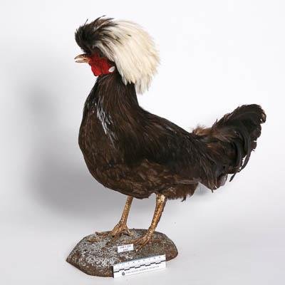 Чучело. Курица породы Голландская белохохлая. Классификация: Хордовые Chordata, Позвоночные Vertebrata, Птицы Aves, Курообразные Galliformes, Фазановые Phasianidae