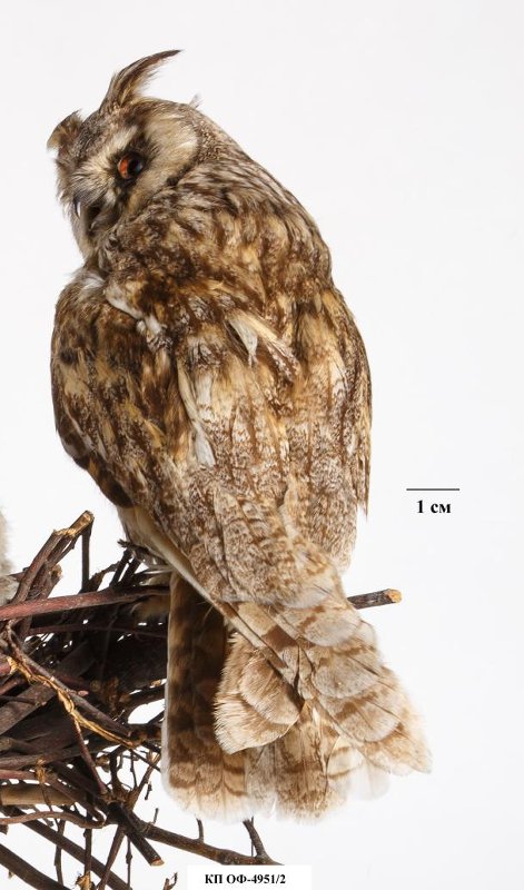 Чучело в биогруппе. Сова ушастая, взрослая. Asio otus (L.,1758). Классификация: Хордовые Chordata, Позвоночные Vertebrata, Птицы Aves, Совообразные Strigiformes, Настоящие совы Strigidae, Ушастая сова Asio otus (L.,1758)