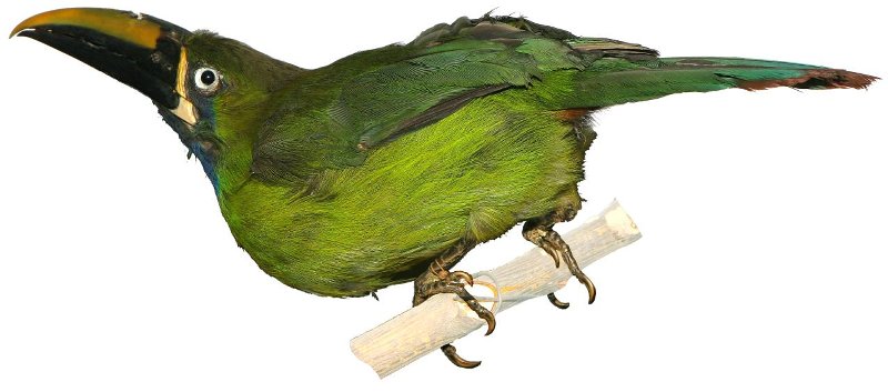 Чучело. Туканет синегорлый..... Aulacorhynchus coerulegularis ? Классификация: Хордовые Chordata, Позвоночные Vertebrata, Птицы Aves, Дятлообразные Piciformes, Тукановые Ramphastidae, Изумрудный туканет Aulacorhynchus prasinus (Gould,1833)