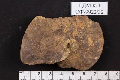 Фрагмент раковины головоногого моллюска. Раковина спиральнозавитая, инволютная, с сильнообъемлющими оборотами. Пупок узкий и глубокий. Часть последнего оборота раковины отломана.