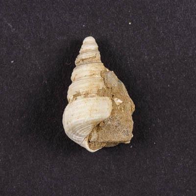 Раковина небольшого брюхоногого моллюска с фрагментом вмещающей породы. Раковина спиральнозавитая, высокая, башенковидная. Первый оборот - отломан. Устье простое овальное, без синуса. Скульптура внешней поверхности - многочисленные тонкие невысокие продольные и поперечные рёбрышки.