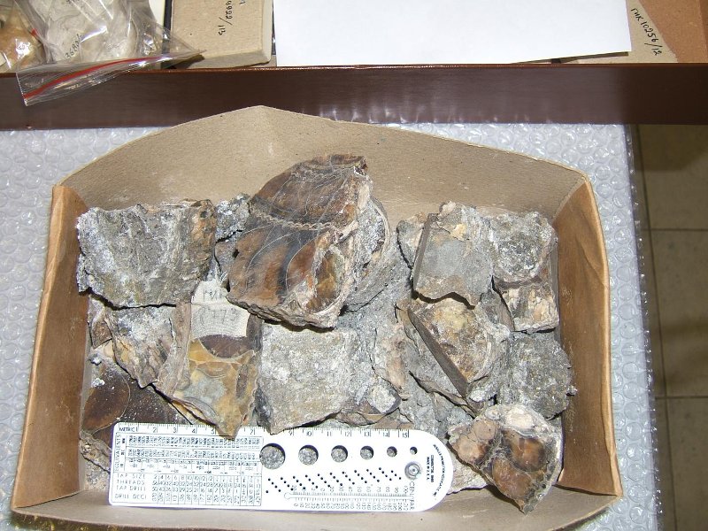 Распиленная и пришлифованная раковина аммонита. В результате естественного внешнего воздействия на пиритизированный образец, образец распался на многочисленные фрагменты.