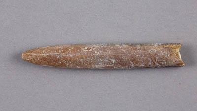 Фрагмент ростра белемнита. Ростр цилиндро-конический. Поперечное сечение в приустьевой части - вертикально-элиптические, в апикальной - округло-треугольное. В апикальной части на поверхности ростра, на его брюшной и боковых поверхностях, наблюдаются нечеткие отпечатки кровеносных сосудов. Брюшная борозда - отсутствует. Альвеола - закрыта прбкой из вмещающей породы. Спайка наблюдается только в пределах альвеолы. Терминальный шипик в апикальной части и фрагмакон - не сохранились. Общая окраска - тёмно-бежевая.