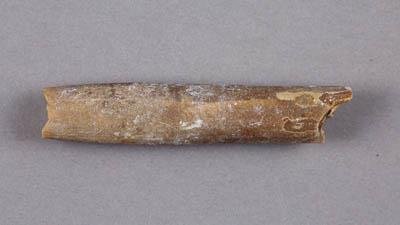 Фрагмент ростра белемнита. Ростр цилиндро-конический. Поперечное сечение в приустьевой части - вертикально-элиптические, в апикальной - округло-треугольное. В апикальной части на поверхности ростра, на его брюшной и боковых поверхностях, наблюдаются нечеткие отпечатки кровеносных сосудов. Брюшная борозда - отсутствует. Альвеола - узкая и короткая. Спайка наблюдается только в пределах альвеолы. Апикальная часть ростра с терминальным шипиком и фрагмакон - не сохранились.
