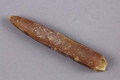 Ростр крупного белемнита. Скорее веретёновидной чем циллиндро-конической формы. Терминальный шипик и фрагмакон - не сохранились. Окраска - коричневая.