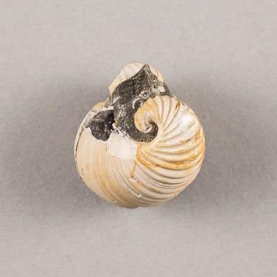 Раковина небольшого двустворчатого моллюска. Частично повреждена. Раковина равностворчатая, замкнутая, с сильно развитыми, спирально закрученными макушками. Связка в глубокой бороздке. Общая окраска - светло-серая раковина на тёмном фоне породы.