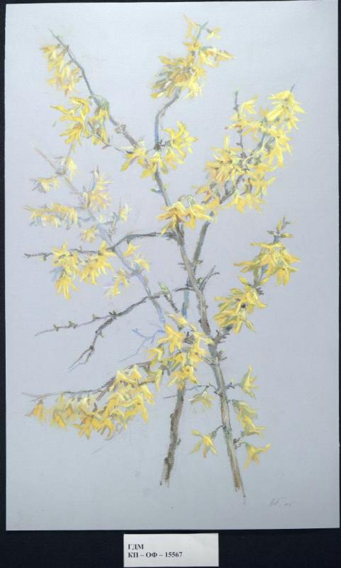 Вертикальный формат: изображение двух веток цветущей форзиции