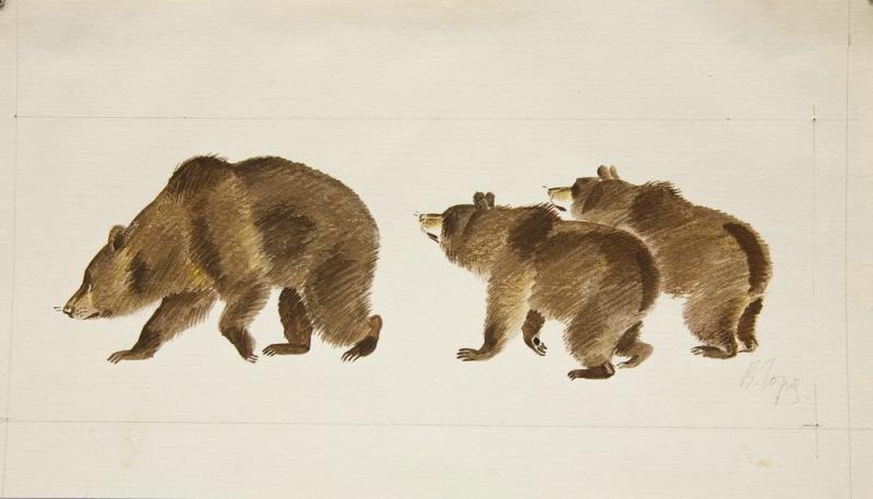 Формат горизонтальный. На листе представлена 3-х фигурная композиция: изображены медведица и следующие за ней два медвежонка. Медведица изображена в профиль (движение влево) в динамичной позе передвижения, голова опущена вниз, левая передняя конечность согнута в суставе и приподнята над землёй. Остальные конечности касаются земли. Медвежата изображены со спины, в статичных позах. Фигуры их расположены параллельно относительно друг друга. Окрас медведей от шоколадно-корчневого до серовато-коричневого с палевым оттенком.
