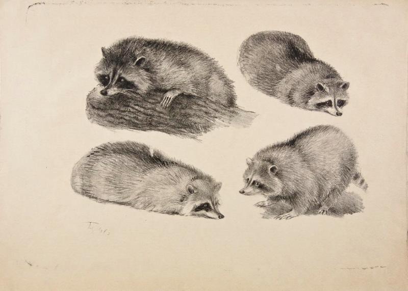 Горизонтальный формат. Четыре наброска енота: енот, выглядывающий из-за ствола лежащего дерева, два наброска лежащего енота и один стоящего.