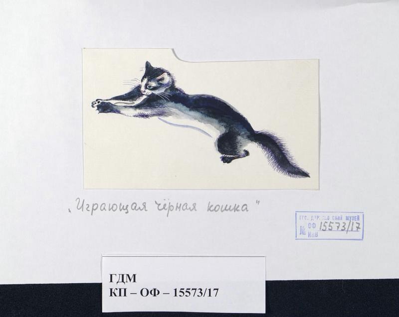 Представлена лёжа в профиль, передние лапы обе видны (параллельно вытянуты вперёд). В них, возможно, животное удерживает предмет, с которым играет. Окрас шерсти чёрно-белый. На левом боку кошки между чёрной верхней частью и белой нижней проходит разделительная голубоватая полоса. хост откинут назад. Туловище кошки на листе расположено по диагонали.