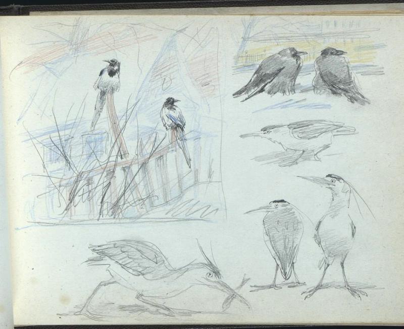 Наброски и рисунки сорок, ворон и квакв. Лист из альбома