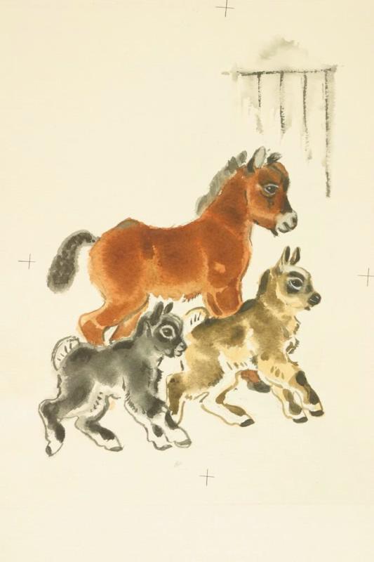 В нижней части листа боком головами вправо изображены коричневый жеребёнок, серый и светло-коричневый козлёнок. Вверху справа намечены прутья клетки.