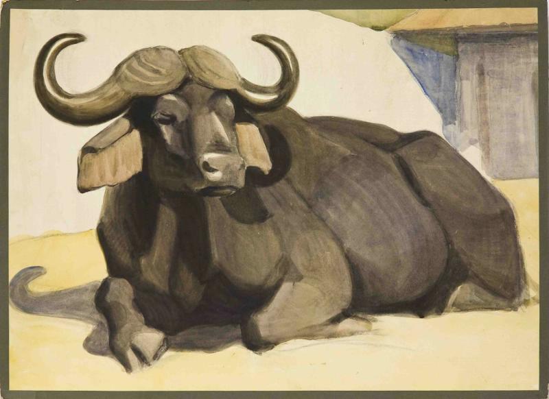 Композиция горизонтального формата. Изображен крупным планом лежащий черный африканский буйвол. Животное лежит, подогнув в колене левую переднюю ногу и вытянув вперед полусогнутую правую. Голова его в три четверти повернута направо, глаза полузакрыты. Буйвол изображен на фоне белой стены, земля желтого цвета. Справа вдали видно некое сооружение со светло-коричневой покатой крышей. Источник освещения располагается вверху справа.