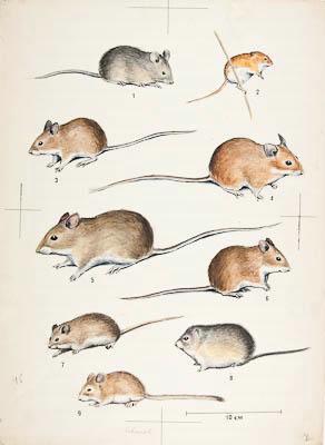 Млекопитающие СССР. Представители отряда Грызуны, семейств мышеобразные, сони, селевинии и хомякообразные: 1 домовая мышь, 2 мышь-малютка, 3 лесная мышь, 4 желтогорлая мышь, 5 горная мышь, 6 азиатская мышь, 7 мышевидная соня, 8 селевиния, 9 мышевидный хомячок. Рисунок