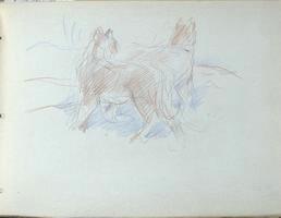 В верхней части листа крупно выполнен набросок двух тигров. Животные изображены боком, тот что на первом плане, головой влево, второй – головой вправо, оба смотрят вправо. Альбом в светлом картонном переплёте с четным корешком из кожзаменителя, страницы сшиты верёвками, продетыми в отверстия. В каждом листе по три отверстия. На внутренней стороне обложки внизу у корешка тушью подпись и дата: «М. Кукунов 1992».
