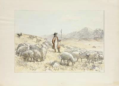 Горизонтальный формат. В каменистом горном пейзаже изображен стоящий посреди пасущейся отары овец чабан. На заднем плане пастушья собака сгоняет отбившихся овец. Подписной "М.Г. 44"