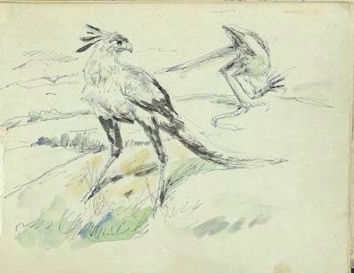 В пейзаже изображены две птицы. На первом плане птица-секретарь в три четверти влево с головой, повёрнутой в профиль вправо. На дальнем плане справа изображена в профиль влево птица, схватившая змею. Она прижала её к земле и клюёт. Альбом в тряпичном тиснёном бежевом переплёте, прошитом белой верёвкой, продетой в три отверстия у корешка. В альбоме 57 листов (пустых листов - три: 1,42,57).