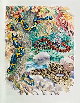 Вертикальный формат. На листе изображены: амурский полоз; тигровый уж; щитомордник.
