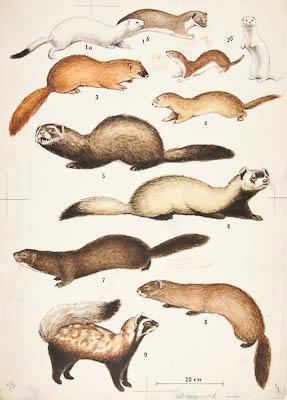 Млекопитающие СССР. Представители отряда Хищные, семейства куньи: 1а горностай (зимой), 1б горностай (летом); 2а ласка (летом), 2б ласка (зимой); 3 колонок, 4 солонгой, 5 чёрный хорь, 6 степной хорь, 7 американская норка, 8 европейская норка, 9 перевязка. Рисунок