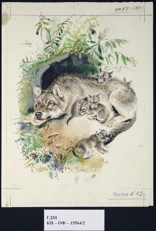 Волчица с волчатами (пять детёнышей) подле логова. Иллюстрация к рассказам Баймухаметова "Хитрая волчица". Графическая работа