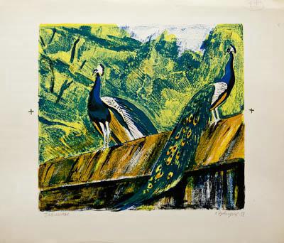 Горизонтальный формат. Двухфигурная композиция с изображениями павлинов, восседающих на двускатной крыше некой хижины. Птицы представлены на фоне зелёной растительности в гористой местности. Павлин справа изображён в профиль – вид со спины, хвост опущен и сложен. Окрас хвоста тёмный с декоративным условным рисунком, напоминает набивную ткань в цветочек. Павлин, изображённый левее, представлен в полуфас, его хвост не виден. Птицы смотрят в противоположные стороны.Колористическое решение четырёхцветное: зелёный густой, лимонно-жёлтый, охристо-жёлтый и тёмно-синий.