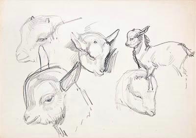 Горизонтальный формат. Пять набросков на одном листе: четыре наброска головы в разных ракурсах и одно профильное изображение.