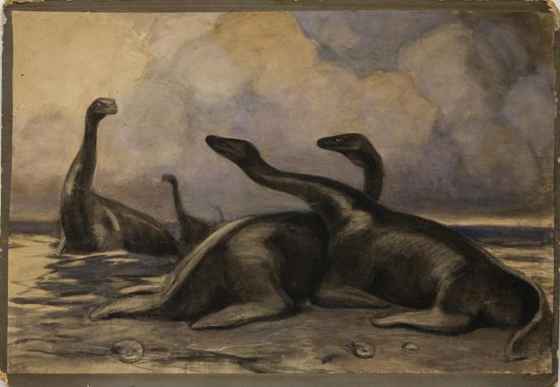 Композиция горизонтального формата, изображены пять плезиозавров на фоне морского пейзажа. На первом плане на маленьком участке суши лежат два плезиозавра, один из них грудью прислонился к правому боку второго. Головы обоих плезиозавров на длинных шеях повернуты налево, в сторону третьего плезиозавра, движущегося к ним со стороны моря на втором плане. Его ласты и часть тела скрыты под водой. На третьем плане из воды поднимаются еще две головы плезиозавров на длинных шеях. Окраска всех динозавров одинаковая, темно-серая. На сером песке возле плезиозавров на первом плане лежат две спирально закрученные раковины аммонитов. Линия горизонта расположена низко, море вдали темно-синего цвета. Небо сплошь покрыто кучевыми облаками. В целом изображение напоминает гризайль.