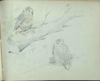 Вверху слева изображена полярная сова, сидящая на толстом бревне, на фоне маленьких ёлочек. Сова сидит в три четверти вправо, её голова развернута в три четверти влево. Рисунок подцвечен цветными карандашами. Внизу справа набросок простым карандашом второй совы (возможно, неясыти). Сова показана со спины, голова развёрнута в три четверти влево. Альбом в твердом темно-коричневом переплете с рельефными пятиконечными звездами у корешка и теснённой надписью с золотистыми буквами "Альбом". Страницы альбома скреплены розовой лентой. На обложке с внутренней стороны внизу у корешка подпись: "М. Кукунов 1992". На задней обложке штамп "Артель Ленинградский печатник".