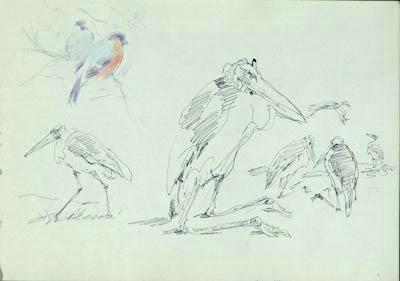 Слева вверху цветными карандашами выполнен рисунок двух снегирей, сидящих на ветке. Слева внизу тушью изображен идущий марабу в профиль влево. В центре крупно – сидящий марабу в профиль вправо. Справа внизу выполнен набросок двух сидящих марабу и птицы на дальнем плане.