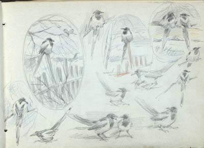 Композиции и наброски сорок. Лист из альбома