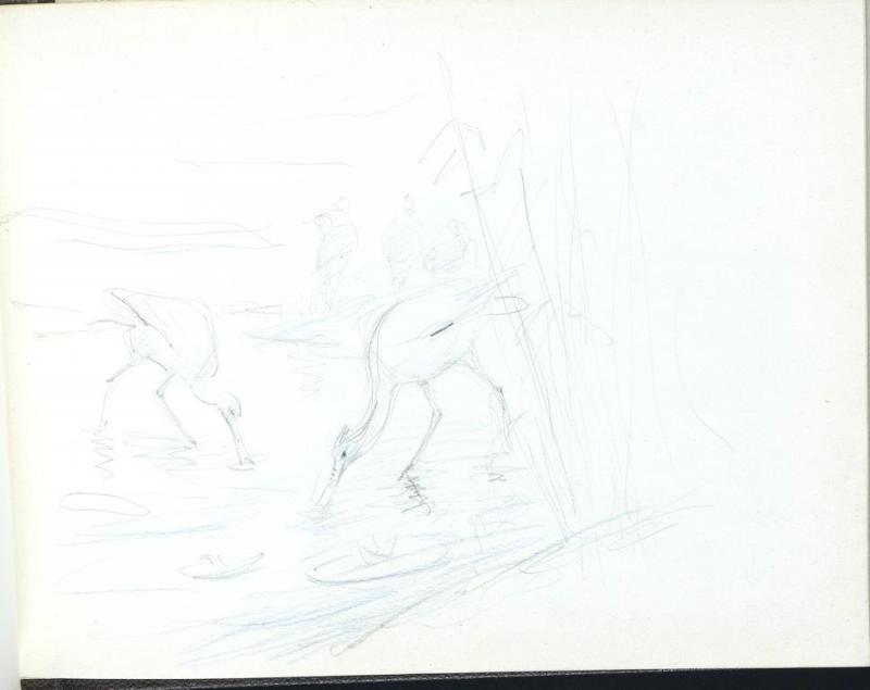 В левой части листа изображен болотистый пейзаж с водяными лилиями на первом плане и с высокими стеблями травы справа. На первом плане боком головами друг к другу изображены две колпицы, ищущие добычу в воде, они опустили клювы в воду. На дальнем плане едва намечены ещё три колпицы. Рисунок подцвечен синим карандашом. Альбом в твердом темно-коричневом переплете с рельефными пятиконечными звездами у корешка и теснённой надписью с золотистыми буквами "Альбом". Страницы альбома скреплены розовой лентой. На обложке с внутренней стороны внизу у корешка подпись: "М. Кукунов 1992". На задней обложке штамп "Артель Ленинградский печатник".