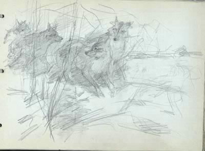 На весь лист изображена композиция со стай волков в пейзаже среди высокой травы. 4 волка идут слева направо, волк, расположенный на первом плане обернулся и смотрит назад..