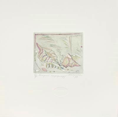 Формат горизонтальный. Натюрморт из 3-х раковин брюхоногих моллюсков. Изображения раковин стилизованные, условно-декоративные. Контуры и скульптура раковин обозначены графическими чёрными линиями. Цвет раковин сиреневато-серый. В тех же тонах решён и общий колорит, ассоциирующийся с сумерками на берегу моря.