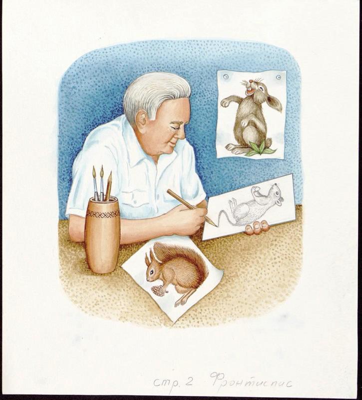 На фоне условного фрагмента голубой стены, к которой прикреплён кнопками белый лист бумаги с изображением "смеющегося" зайца. Седовласый мужчина (Г.Д. Целищев) в белой рубашке с короткими рукавами представлен в полуфас (голова в профиль, опущена вниз). Этот мужчина - художник Геннадий Дмитриевич Целищев, известный иллюстратор детских книг. Он запечатлён в момент завершения рисунка с изображением мыши, выполненного карандашом (завершение приходится на кончик мышиного хвостика). На столе на первом плане - рисунок с изображением белки с шишкой. Левее рисунка белки - бочонкообразная карандашница с орнаментом по верхнему ободку ( в ней - две кисточки и один карандаш). Стол условно обозначен плоскостью серовато-песочного цвета.