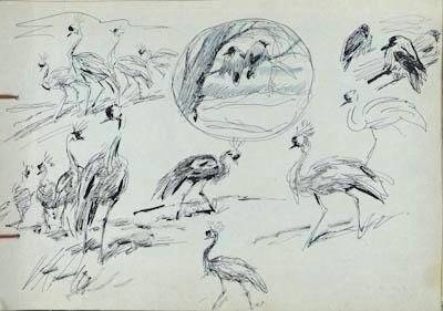 В левом верхнем углу изображены 4 венценосных журавля, идущие справа налево. В левом нижнем углу изображены 4 журавля, идущие на зрителя. Правее – идущий слева направо журавль, под ним – идущий справа налево журавль. В центре у верхнего края листа в овале изображены две вороны на ветке. В верхнем правом углу два наброска вороны. Ниже два наброска журавля в профиль влево.