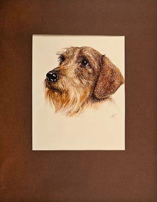 Формат вертикальный. Голова собаки представлена в полуфас (смотрит влево). Глаза и нос чёрного цвета. Верх головы и уши покрыты коричневой шерстью, нижняя часть морды - шерстью желтовато-палевого цвета.