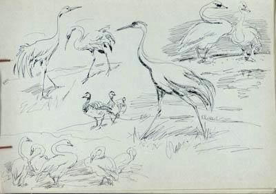 Вверху слева крупно изображены два журавля, один в профиль вправо, второй в профиль вправо. Ниже набросок трёх белощёких казарок. В нижнем левом углу набросок пяти лебедей. В верхнем правом углу два стоящих лебедя. В центре листа крупно в профиль влево изображен идущий журавль.