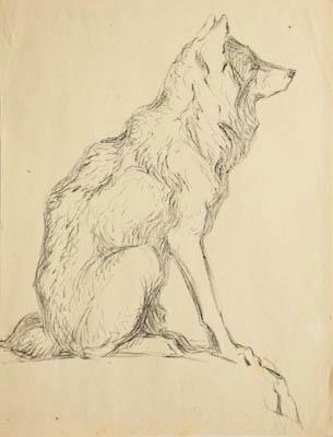 Выбран вертикальный формат. В центре листа крупным планом изображён впрофиль волк, сидящий на обрыве. Голова немного поднята вверх. Передние конечности выставлены вперёд. Ими волк опирается о землю, чтобы не сорваться вниз. задние конечности согнуты и тоже покоятся на земле. Хвост покоится на плоскости. Поза спокойная. Взгляд устремлён вдаль (вправо). Посредством штрихов передана фактура густой шерсти.