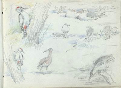 В левой части листа два рисунка с изображением, дятла, сидящего на стволе дерева и набросок пёстрой птицы с длинным клювом. В правой части вверху изображены стаи чаек в пейзаже. В нижнем правом углу набросок кваквы на ветке. Альбом в твердом темно-коричневом переплете с рельефным орнаментом у корешка (пятиконечные звезды, серп и молот) и теснённой надписью с золотистыми буквами "Альбом". Страницы альбома скреплены пестрой сине-белой лентой. На задней обложке штамп "Артель Ленинградский печатник".