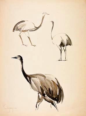 Формат вертикальный. Три наброска страуса на одном листе. Вверху два линейно-штриховых чёрно-белых наброска: слева изображение полуфаса птицы (движение вправо), справа, чуть ниже – изображение страуса сзади (движение влево). Шея вытянута в вертикальной плоскости. Оба изображения расположены почти друг против друга (tête-à-tête) . Внизу представлено крупным планом фрагментарное профильное изображение идущего страуса (движение влево). Ноги ниже бёдер не изображены. Окрас страуса серо-чёрно-коричневый.