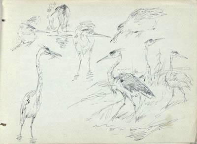 На листе изображено 8 птиц. Вверху слева – две кваквы, одна в профиль вправо, вторая со спины. Вверху справа кваква боком головой влево. Вверху в центре – набросок цапли. Внизу слева – цапля в профиль вправо. Внизу справа пейзаж с тремя цаплями. Альбом в твердом темно-коричневом переплете с рельефным орнаментом у корешка (пятиконечные звезды, серп и молот) и теснённой надписью с золотистыми буквами "Альбом". Страницы альбома скреплены пестрой сине-белой лентой. На задней обложке штамп "Артель Ленинградский печатник".