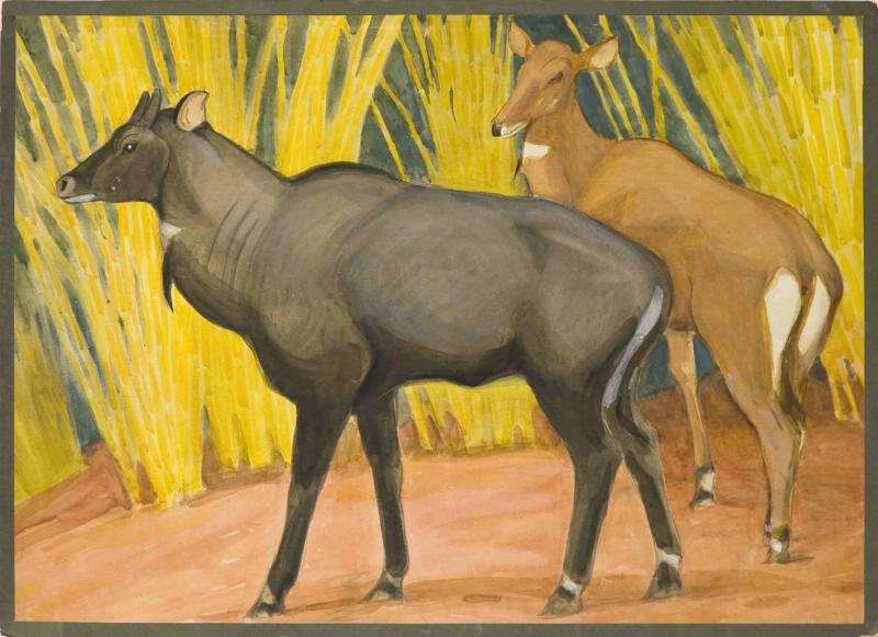 Композиция горизонтального формата, изображены две антилопы Нильгау – самец и самка. На первом плане в центре стоит темно-серый самец с короткими прямыми рожками. Он нарисован в профиль головой налево. На втором плане справа за самцом стоит безрогая светло-коричневая самка. Она изображена в три четверти со спины, голова ее повернута в сторону самца. Земля на первом плане охристо-красного цвета. Антилопы изображены на фоне желто-зеленых зарослей бамбука.