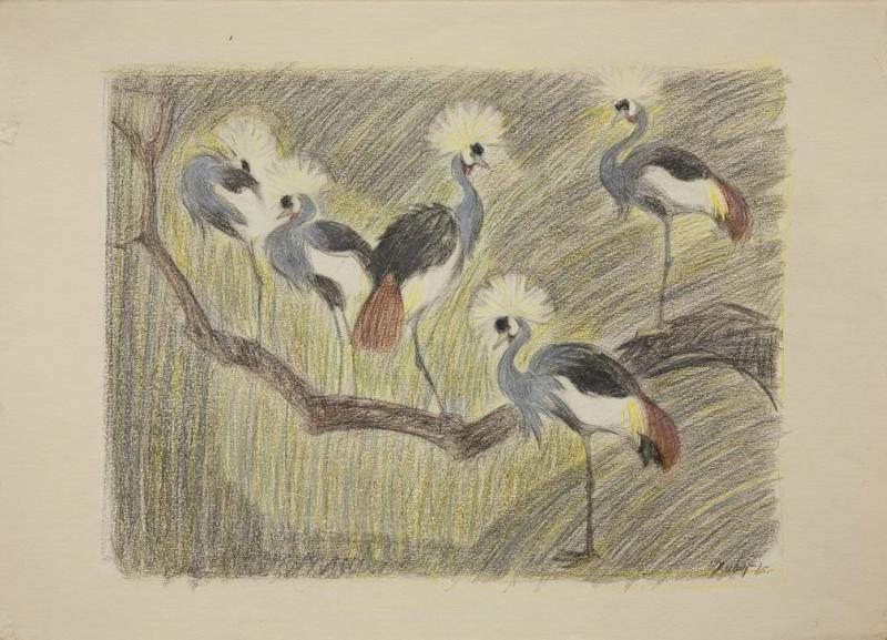 Композиция горизонтального формата, основная колористическая гамма холодная. Изображены пять венценосных журавлей в различных позах. На первом плане справа на земле стоит, повернувшись в профиль налево один из журавлей. Окраска всех птиц одинаковая: у них пышные желтовато-белые хохлы на головах, лоб черный, щеки белые, клюв светлый. Шея и грудь серые; спина и живот черные; концы крыльев белые; хвосты красновато-коричневые, по краям желтые, снизу черные. Остальные четыре птицы сидят на длинной толстой темно-коричневой ветке дерева. Одна птица стоит справа, остальные три держатся рядом друг с другом слева. Фон – желтовато-серый, по углам становится чуть темнее. По краям листа оставлены не закрашенные поля шириной примерно 35 мм у верхнего, 30 мм у нижнего и по 50 мм у правого и левого краев.