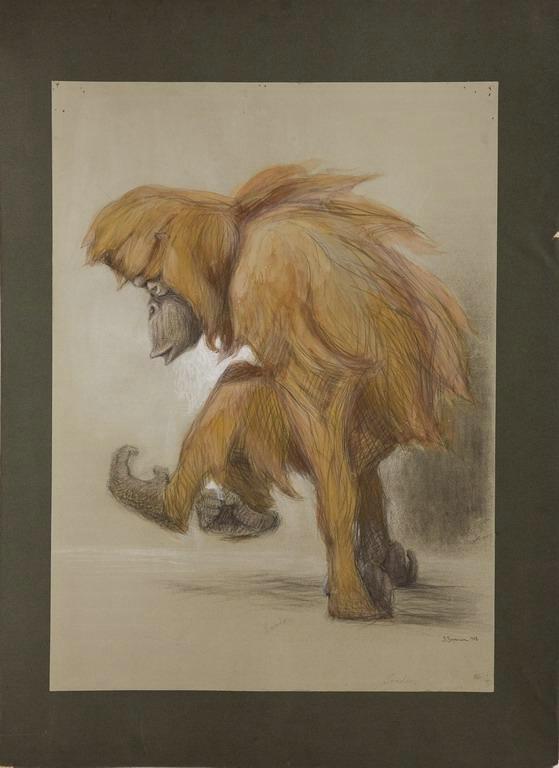 На лист картона вертикального формата, оклеенный темно-серой бумагой, наклеен лист бумаги с изображением. Композиция вертикального формата. Изображен крупным планом в профиль идущий справа налево молодой орангутан. Он опирается о землю костяшками пальцев передних рук. Задние ноги, согнутые в коленях, вынесены вперед. Голова опущена, взгляд направлен вниз. Шерсть орангутана длинная, светло-рыжая. Кожа на лице и руках розовато-серая, покрытая сеткой морщин. Справа на горизонтальной плоскости и на стене обозначена штриховкой и растушевкой падающая тень.