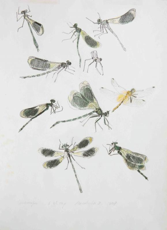 Композиция вертикального формата. На белом листе бумаги цветными карандашами нарисованы десять стрекоз, девять из них одного вида, а одна - другого. В левом верхнем углу листа изображена сидящая стрекоза, ее длинное тонкое тело почти параллельно левому краю бумаги, крылья сложены за спиной. У нее зеленое тело и глаза, а крылья зеленовато-желтые с большими черными пятнами ближе к краям. Чуть ниже такая же стрекоза изображена в профиль, головой направо. Справа находятся еще два рисунка стрекоз того же вида, обе они изображены в профиль, лапками налево, крылышки сложены за спиной. Чуть ниже черным карандашом отдельно прорисована голова стрекозы с лапками (первая пара лапок устрашающе зазубренная) и передней частью тела. В центре листа находится профильное изображение такой же стрекозы, сидящей горизонтально, головой направо. Слева от нее нарисована такая же стрекоза чуть меньшего размера со сложенными лапками. Справа находится стрекоза другого вида: у нее оранжевое тело и прозрачные крылышки с желто-оранжевыми пятнами у основания и маленькими черными пятнышками на концах. Она сидит, разведя в сторону свои четыре крыла. Внизу нарисованы еще две зеленые стрекозы: одна показана сверху, крылья разведены в стороны; а другая вид сверху в три четверти, головой налево, крылышки почти сложены.